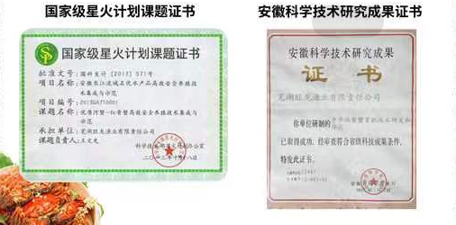 我公司获得优质河蟹一红膏蟹高效安全养殖技术集成于示范,科技部国家级星火计划项目立项。制定了“中华绒螯红膏蟹(雄蟹)”的企业质量技术标准;获得了中华绒螯蟹育肥技术的安徽省级科研成果。