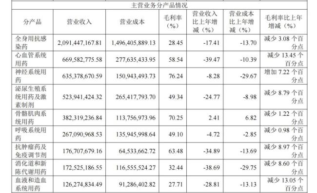 如神经系统用药注射用盐酸瑞芬太尼、盐酸米那普仑片,全身用抗感染药头孢呋辛系列、头孢克肟系列以及头孢地尼分散片等重点产品,虽然销量增长,但是收入规模同比均为下降;心血管系统用药、消化道和新陈代谢用药、抗肿瘤药及免疫调节剂三大领域销售收入下降幅度也较大,同比分别下降39.47%、38.69%、34.89%。