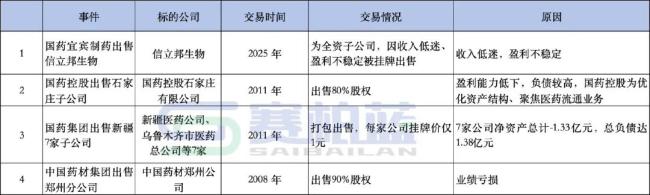 近些年来,国药宜宾制药出售信力邦生物、国药控股出售石家庄子公司80%股权,被出售的资产主要集中在亏损、低效或非核心业务。