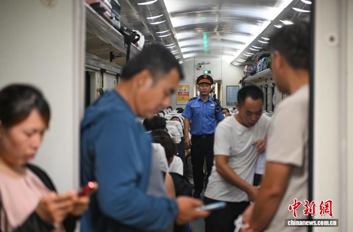 图为列车长左强引导旅客乘车。中新社记者 于海洋 摄