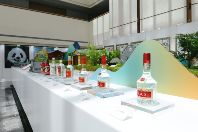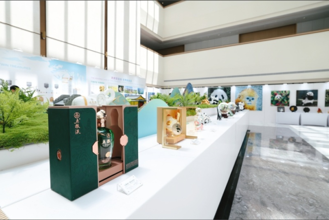 在占地170㎡的沉浸式空间中,“双宝展”用七大板块构建明暗交织的立体叙事网络,以横断山脉为视觉明线,“和美哲学”为文化暗线,从不同维度讲述中国故事:以立体书法卷轴造型呈现《双国宝赋》《五粮液大赋》;以图文、时间轴形式展示大熊猫和金丝猴知识;以世界地图、大事件形式展示双宝和五粮液“和美全球行”足迹;以熊猫、竹子、三江源为背景结合五粮液元明八大古酒坊微缩模型,展现“酿酒生态圈”与生物多样性、自然保护的关联。展览中,大熊猫邮集、“双宝”摄影作品、大师联名艺术作品、“双宝”文献史料、五粮液熊猫文化酒产品、“双宝”艺术作品等一一精彩陈列……