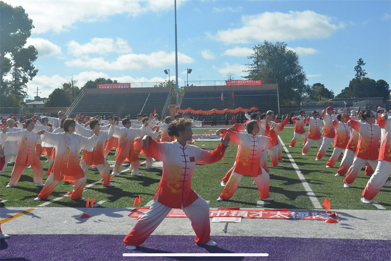 人民网红木城8月3日电 (记者邓圩)近百支队伍高举队旗、精神抖擞地步入会场;250位太极爱好者表演太极拳与太极扇,展现中华武术之美;241位广场舞爱好者携手演出“最炫民族风”……日前,美国北加州华人文化体育运动大会在旧金山湾区红木城举行开幕式。