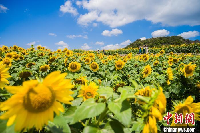 资料图:立秋时节,位于贵州省清镇市卫城镇犀牛村百余亩向日葵花进入最佳观赏期。图为游客在向日葵花海里游览。中新社记者 唐哲 摄