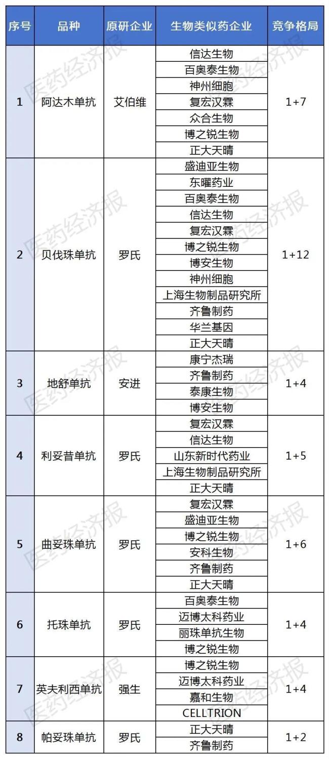 修美乐的核心专利于2017年在国内到期,国内的仿制药企业快速跟上。2019年11月,百奥泰的阿达木单抗生物类似药格乐立在国内获批上市,作为首仿药与修美乐展开竞争,随后博锐生物、信达生物、复宏汉霖等药企的阿达木单抗生物类似药相继上市。据统计,2021年国内阿达木单抗生物类似药的市场份额已超过原研。