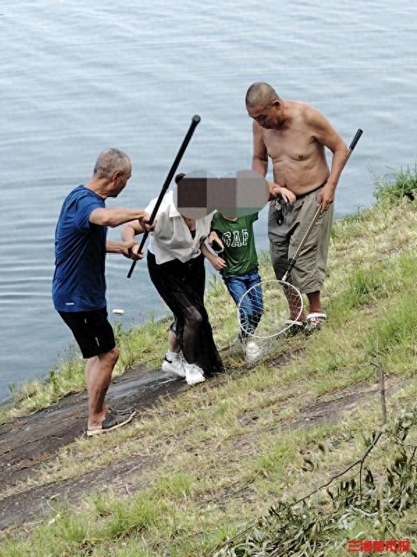 事发突然,郑应良一边高声呼喊有人落水,一边拿起社区配备在河堤旁的救生杆营救。同队的陈建敏和恰好路过的退役军人叶建军听到喊声,迅速前来帮忙。陈建敏稳稳托住杆尾,叶建军俯身把杆头递向水里,两人合力往岸边拽。孩子母亲拼尽全力抓住杆梢,在众人的帮助下,短短3分钟,母子俩成功上岸脱险。