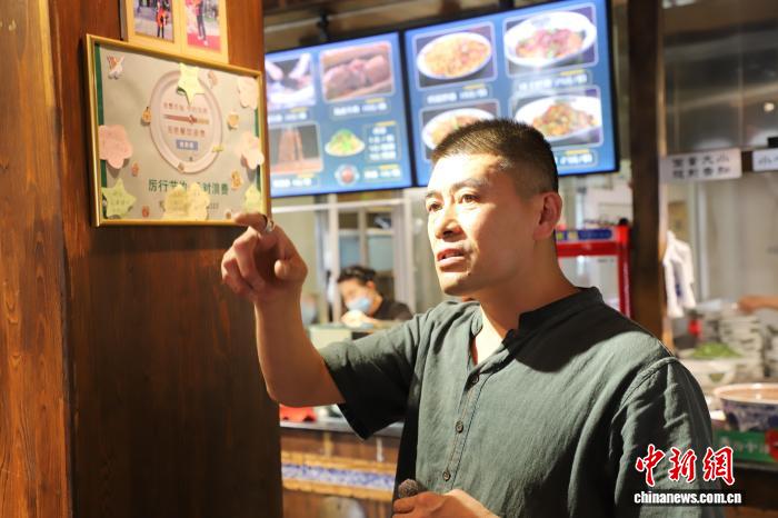 图为面馆负责人王高翔讲述便签故事。中新网记者 张林虎 摄