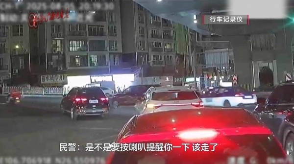 民警:其他很多辆车都走了的,你还在那里停着,是不是要按喇叭提醒你一下,该走了。你说他的车子在你的后方,他怎么能超你的车。