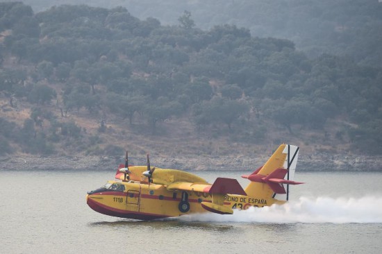8月18日,在西班牙卡塞雷斯省,参与灭火的飞机正在取水。新华社发(古斯塔沃·巴连特摄)