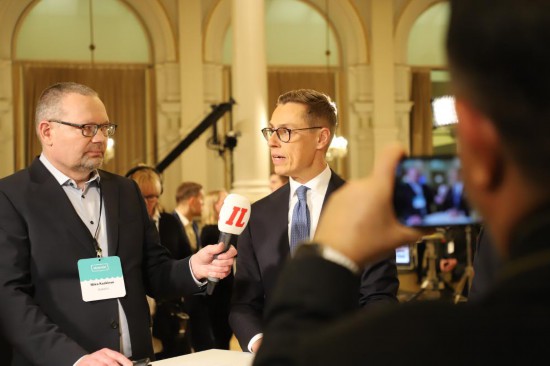2024年2月11日,斯图布在芬兰赫尔辛基市政厅接受当地媒体采访。新华社记者 陈静 摄
