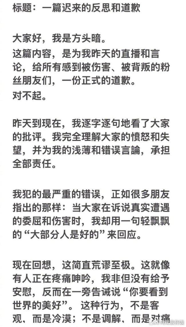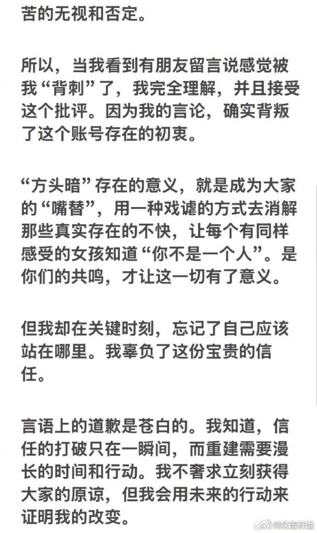 方头暗为争议言论道歉,承认迷失女性共鸣初心。