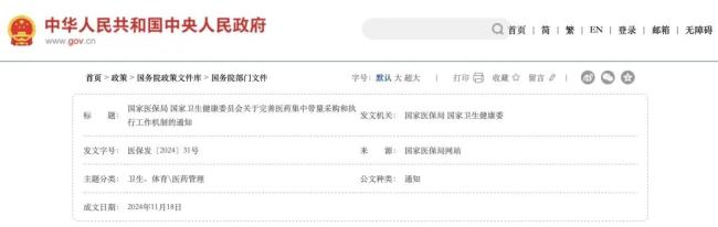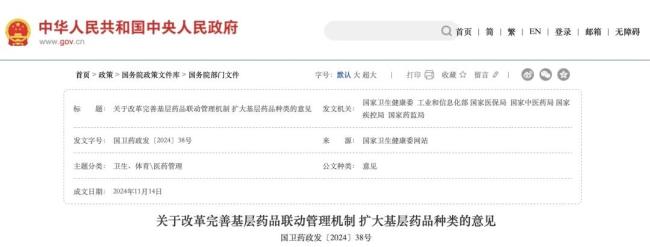 2024年11月14日,国家卫健委国家医保局等六部门发布《关于改革完善基层药品联动管理机制扩大基层药品种类的意见》进一步提出,以国家基本药物目录、国家医保药品目录和国家集中带量采购中选的药品为重点,规范扩展基层联动药品种类,并动态调整。