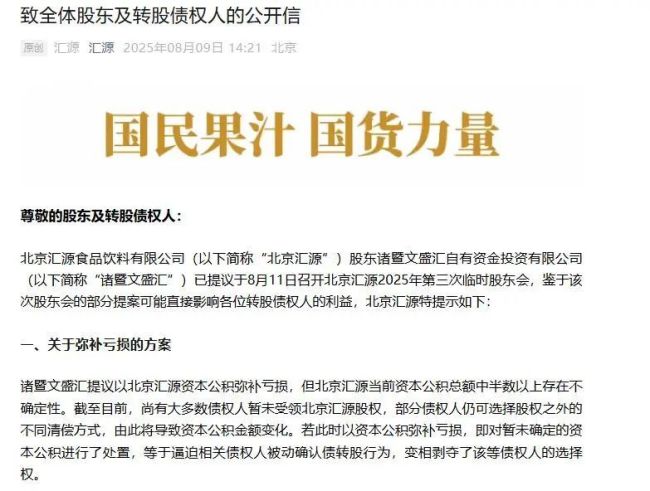8.5亿救命钱逾期,汇源被资本榨干了 资本游戏下的果汁巨头危机!汇源公司面临严重的内部危机和资本斗争。8.5亿救命钱逾期未缴,大股东阻止公司唯一的职工监事发言,创始人朱新礼重回公司,而现任董事长鞠新艳却将公司告上法庭。一封《致全体股东及转股债权人的公开信》揭示了这些矛盾。