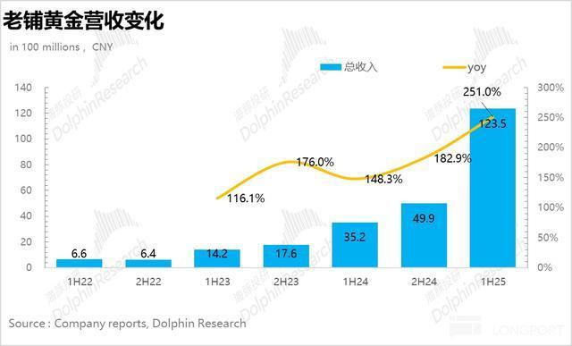 1、业绩环比提速。25H1老铺黄金实现总营收123.5亿元,同比增长251%,接近指引上限。从趋势上看,从24H1开始公司的业绩连续两次环比提速,仍然处于快速扩张期,上半年收入超过了去年全年,核心还是受益于黄金的上行周期以及老铺品牌力不断提升带来的客群拓展和破圈。