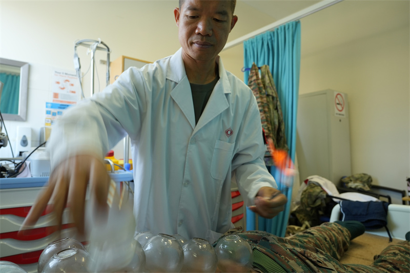 就诊人员中大多患有肌肉骨骼疼痛、关节劳损、消化系统疾病等常见的健康问题,许多患者对针灸治疗表现出特别兴趣,尤其对“左病右治”“上病下治”等中医理论感到好奇。分队医生通过针灸穴位模型,现场为患者解释经络穴位理论与中医整体观念,并根据每个人的具体症状制定不同治疗方案。除了针灸,分队医生也为部分适合的患者提供了拔罐、艾灸等服务。接受治疗的联黎民事雇员法蒂玛说:“我一直听说中医很神奇,这次亲身体验针灸后,确实感到颈部僵硬明显缓解。中医的理论和实践令人着迷。”