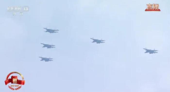 歼击机梯队接受检阅。歼-16D、歼-20、歼-35A、歼-20S、歼-20A,编成两个楔队震撼亮相。