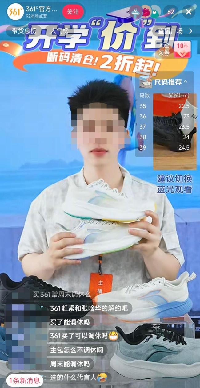 9月2日,许多网友涌入361°直播间,有人要求品牌方立即与张水华解约,也有人表示如果更换代言人会立刻购买产品。当天中午12点左右,361°官方旗舰店直播间内,一名男主播正在介绍一款白色运动鞋,此时直播间有近百名观众,留言几乎都与张水华有关:“调休款有没有”、“解约就下单”、“穿了你们的鞋子跑马拉松能调休吗”。