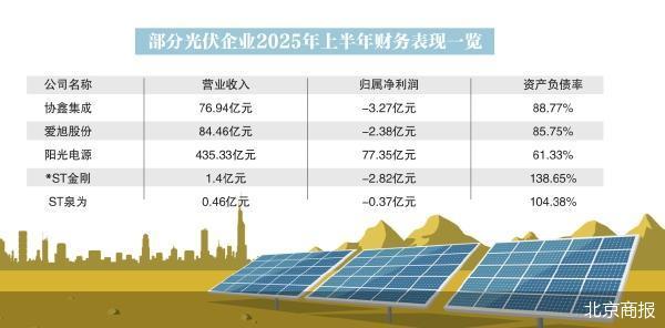 具体来看,*ST金刚、ST泉为两股“资不抵债”,资产负债率分别为138.65%、104.38%,超过100%;亿晶光电上半年资产负债率94.48%,位列第三。另外,协鑫集成、华民股份、爱旭股份、双良节能、帝科股份5股上半年资产负债率则超80%。