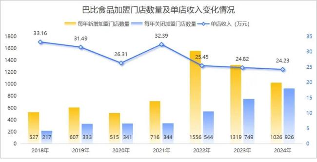2018年至2024年期间,巴比食品加盟门店的单店收入从33.16万元一路下滑至24.23万元,降幅26.93%。