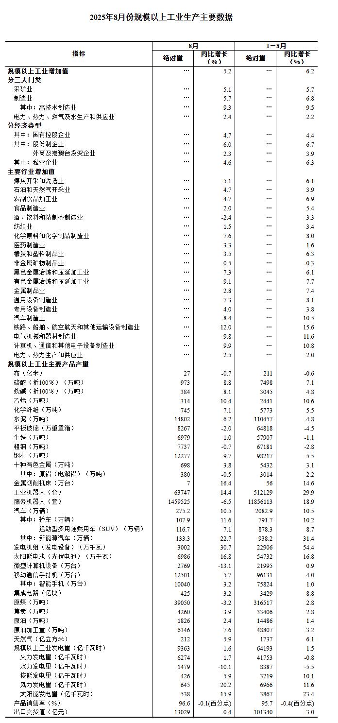 国家统计局:8月份规模以上工业增加值增长5.2%