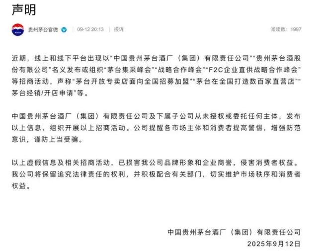 9月12日晚,贵州茅台官方公众号发布严正声明,指出中国贵州茅台酒厂(集团)有限责任公司及下属子公司从未授权或委托任何主体发布相关信息或组织开展相关招商活动。声明中严正表示,公司将保留追究法律责任的权利,并积极配合有关部门,切实维护市场秩序和消费者权益。
