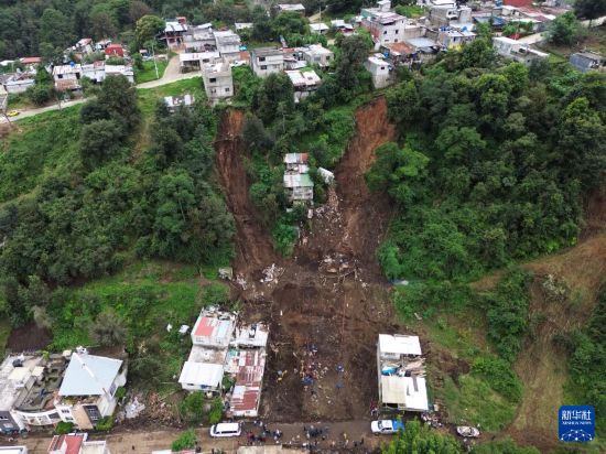 这是10月13日在墨西哥普埃布拉州瓦乌奇南戈市拍摄的降雨引发的山体滑坡现场(无人机照片)。新华社发(弗朗西斯科·卡涅多摄)