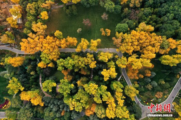 10月16日,航拍青海省西宁植物园。随着气温不断降低,西宁市彩叶树木层林尽染,吸引不少市民前来赏秋。 (无人机照片)张忠苹 摄