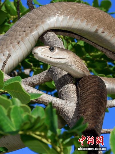 黑曼巴蛇在阳光穿透的枝桠间穿梭(图片来自WolfgangWüster)。施普林格·自然 供图
