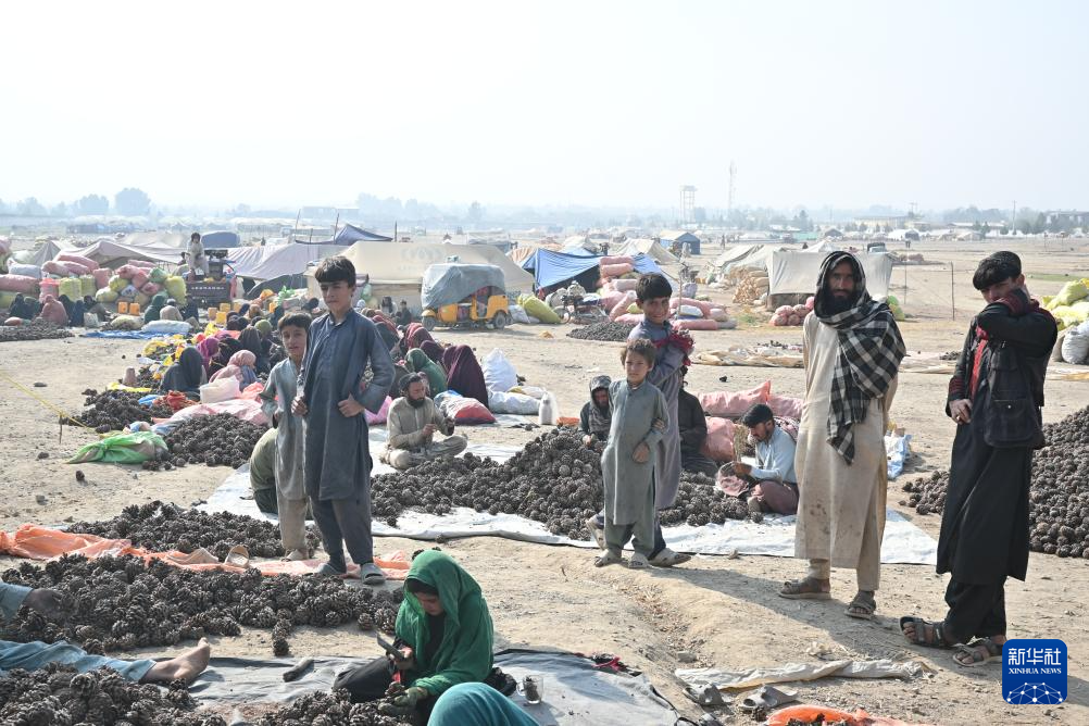 10月28日,在阿富汗霍斯特省的松子加工交易市场,当地儿童帮忙采集松子。 新华社记者 张艺缤 摄