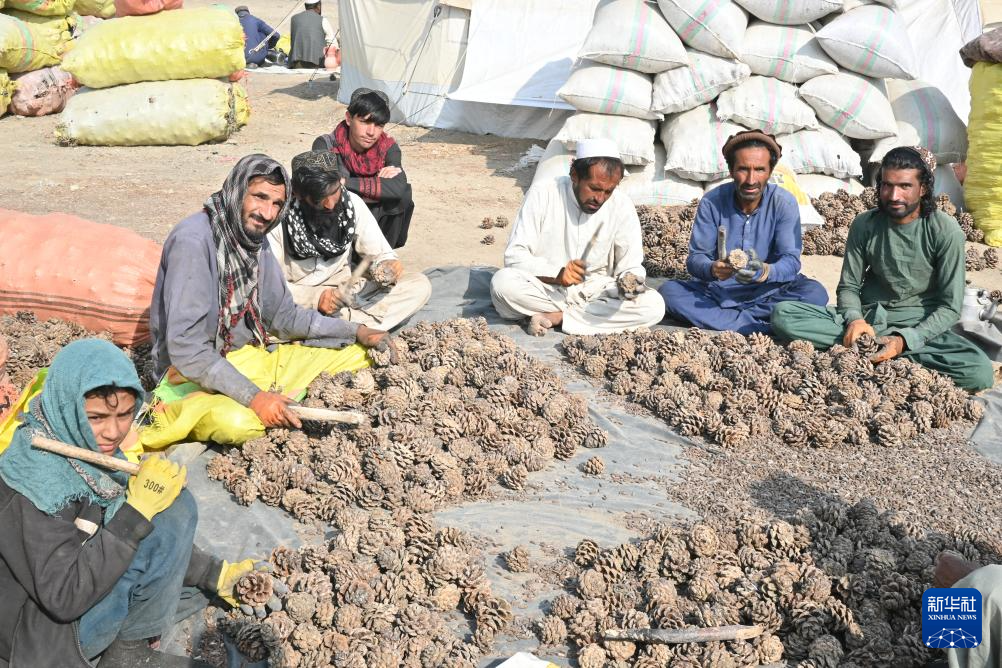 这是10月28日在阿富汗霍斯特省拍摄的松子加工交易市场。用木棍将松子从松塔中敲出来是当地人采集松子的方式。 新华社记者 张艺缤 摄