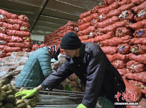 图为工人将马铃薯整齐码放在恒温保鲜库。塔娜 摄
