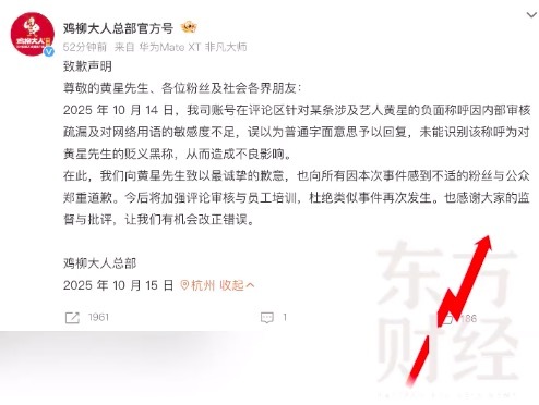 10月15日,@鸡柳大人总部官方号发布致歉声明,“尊敬的黄星先生、各位粉丝及社会各界朋友:2025年10月14日,我司账号在评论区针对某条涉及艺人黄星的负面称呼因内部审核疏漏及对网络用语的敏感度不足,误以为普通字面意思予以回复,未能识别该称...
