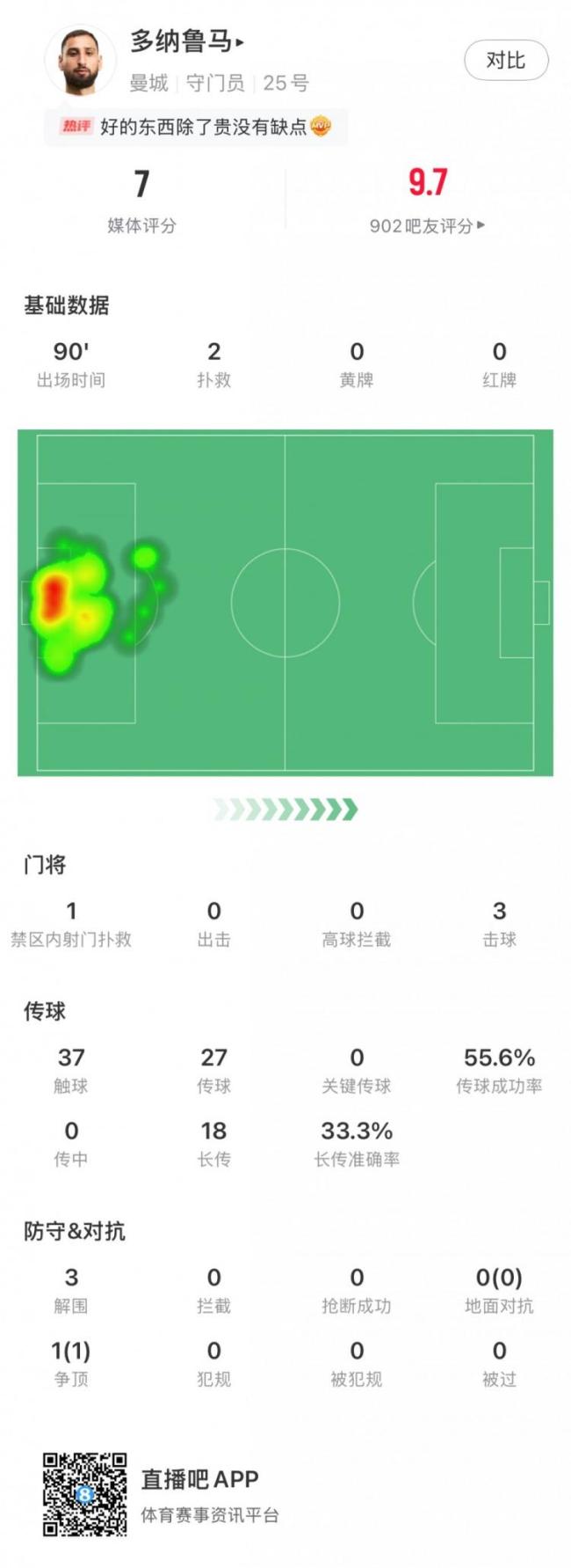 在英超第4轮的曼市德比中,曼城门将多纳鲁马迎来了他的首秀。比赛中,他完成了2次扑救,其中包括1次禁区内射门扑救。此外,他还进行了3次击球、37次触球以及27次传球,传球成功率为55.6%