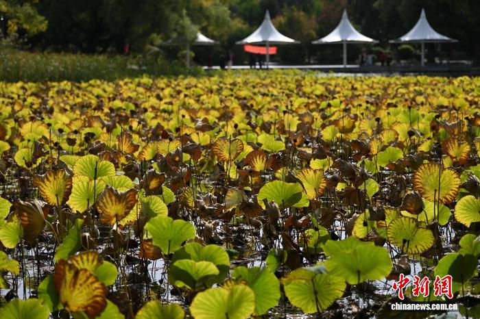 10月11日,内蒙古呼和浩特市,湖内泛黄的荷花叶。中新社记者 刘文华摄 10月11日,内蒙古呼和浩特市,民众在湖边放松。中新社记者 刘文华摄